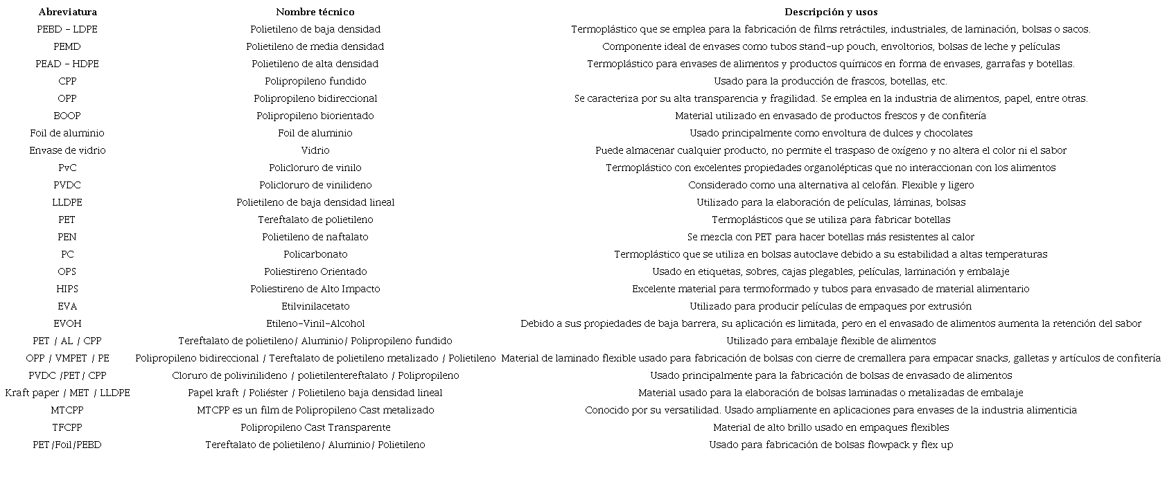En primer lugar, se recolectó información de bases de datos especializadas en estudios de mercados tales como Data Bridge Market Research, Euromonitor, Research and Markets y Technavio. Igualmente, se revisó documentación científica de bases de datos como Scopus y Web of Science, informes de entidades gubernamentales y reglamentaciones de orden nacional e internacional. Adicionalmente, se recolectó información técnica y financiera de 25 tipos de empaques para alimentos, usando la información recolectada de 59 fichas técnicas de empaques encontradas en el mercado (Ver tabla 1).