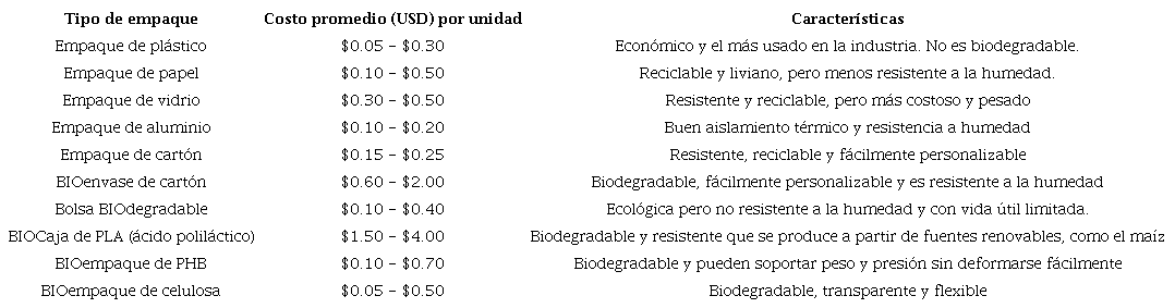 Es relevante considerar que los precios mencionados anteriormente son estimaciones basadas en las fichas técnicas analizadas en este estudio y están sujetos a variaciones según proveedor, calidad y cantidad requerida. Además, cada tipo de empaque y bioempaque presenta características y beneficios específicos, por lo tanto, es fundamental evaluar detenidamente cuál es el más apropiado para cada alimento y obtener cotizaciones de múltiples proveedores antes de tomar una decisión final. Asimismo, la elección entre un empaque convencional y un bioempaque dependerá de los objetivos de sostenibilidad y el presupuesto de la empresa, así como de las necesidades particulares del producto y los requisitos de los clientes.
