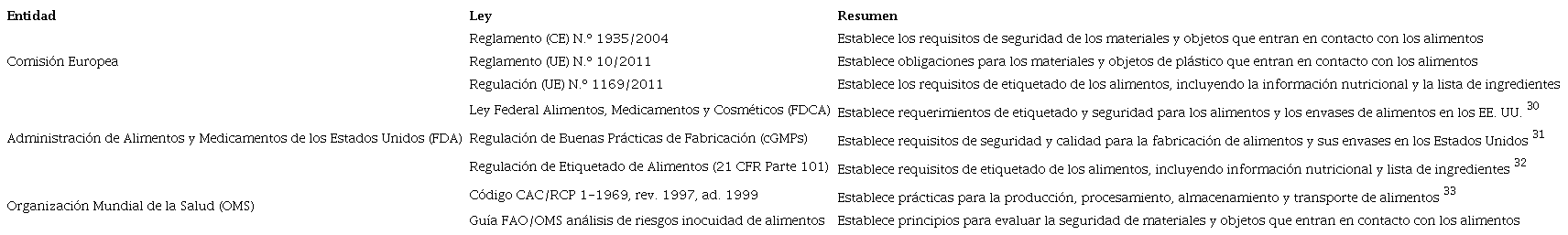 La normativa sobre empaques para alimentos sigue evolucionando constantemente, su origen se remonta a principios del siglo XX cuando se comenzaron a establecer regulaciones para proteger a los consumidores de posibles peligros sanitarios y para garantizar la calidad. Estas reglamentaciones varían según la región geográfica y el país. Sin embargo, hay algunas regulaciones generales que se exponen en la Tabla 4.