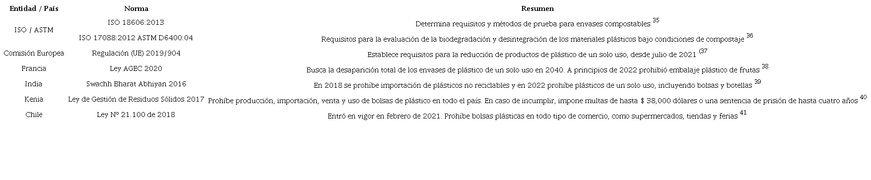 Por su parte, la normativa de bioempaques está en constante evolución debido al aumento de la conciencia ambiental y la preocupación por reducir los residuos generados por los envases. Aunque no existen leyes específicas para los bioempaques en todos los países, hay algunas regulaciones que se pueden aplicar en función de la biodegradación y desintegración, los materiales utilizados y de las características del producto envasado 34. Además, en algunas regiones, se han implementado leyes destinadas a reducir la cantidad de residuos plásticos generados y proteger el medio ambiente (Ver Tabla 5).
