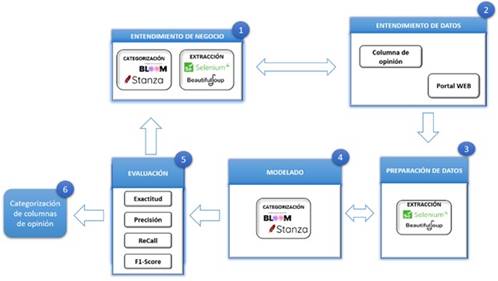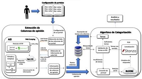 En primer lugar, se extrae la información de páginas web mediante herramientas de web scraping y la creación de un algoritmo que logra analizar, limpiar y almacenar la información obtenida de las etiquetas HTML que se quiere obtener para luego, con ayuda de técnicas de PLN categorizar la información obtenida. Para obtener la información requerida de las columnas de opinión se creó un algoritmo de detección y limpieza de la información apoyándose de BeautifulSoup, una librería que permite determinar en dónde se abren, se cierran y algunas características de las etiquetas HTML como sus atributos o identificadores, simulando al lenguaje XPATH, pero con algunos filtros adicionales como expresiones regulares, validación de tamaño cadenas de caracteres, verificación de etiquetas hijo, entre otras que logran identificar patrones en todos los links dentro de una misma página web.
