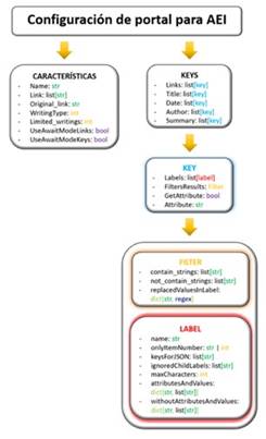 Para extraer la información de una página web se debe configurar un portal web para ese se diseño un tipo de plantilla que le permite al algoritmo de extracción conocer la ubicación de la información y cómo debe limpiar o filtrar la información que obtendrá. La Figura 3 ilustra la estructura de una configuración para un portal web. Las características se refieren a los atributos que singularizan a un portal web; estos se almacenarán en la base de datos. Además, se incluyen opciones que guiarán al algoritmo en la ubicación y extracción de la información, así como en su posterior proceso de limpieza.