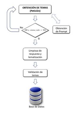 Se elaboró un algoritmo que recibe información extraída y rectificada del paso anterior y la convierte en una lista de temas, utilizando el API de Hugging Face, además del manejo de prompts que dependen del tamaño y los símbolos de puntuación de su contenido y Stanza que aplica la lematización. La API de Hugging Face limita el número de peticiones que recibe y la respuesta dependiendo del tamaño del prompt o de la cantidad de tokens que se le envíe, por eso se diseñó un algoritmo orientado a solucionar los conflictos identificados en donde para cada petición se añade un intervalo de tiempo que varía dependiendo de la respuesta que se obtiene.