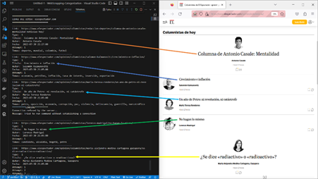 Luego de extractar la información se debe realizar un control de calidad manual para verificar la limpieza, coherencia de la información y se establece que la información no cumple con lo que se esperaba. La información que se extrajo y recuperó consiste en el nombre del autor, fecha de publicación, título, contenido, fecha de extracción y link de la columna de opinión. En la Figura 4 se evidencia el proceso que se siguió para extraer las columnas de opinión y validar las configuraciones respectivas para cada portal.