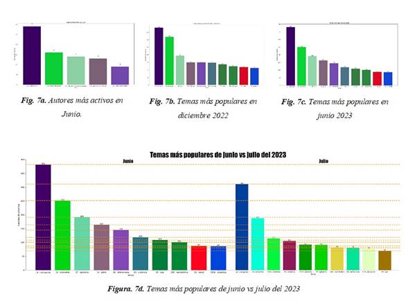 En la Figura 7c “Temas más populares de junio” se hizo un análisis para el mes de junio del 2023 en donde se obtuvieron los 10 temas más tratados durante este mes sin importar el autor o el portal. El tema más popular de junio fue la corrupción en donde la mayoría de los autores que redactaron columnas en este lapso hablaron sobre este tema.