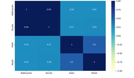 La figura 8 muestra la relación entre el portal y el autor donde se evidencia una mayor correlación comparándola con el resto de resultados y puede deberse a que cada portal tiene sus propios escritores o que estos escriben únicamente para un portal.