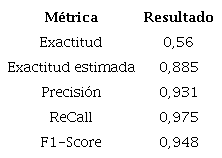 Asimismo, se propuso la métrica (1) para la exactitud debido a que se debe validar la cantidad de predicciones correctas sobre la cantidad total de predicciones, pero al haber múltiples predicciones posibles se debe aplicar otra metodología, ya que la exactitud de la ecuación (2) simplemente verifica si el resultado de predicciones correctas es igual al total de predicciones.