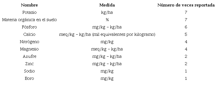 Otro de los componentes más relevantes en la productividad de los cultivos de café es su mantenimiento químico; la variación de la cantidad de nutrientes que recibe la tierra es crucial para las cosechas futuras 44, algunos de los elementos más utilizados, medidos comúnmente en mol/l, son: magnesio, hierro, calcio, boro, nitrógeno, fosforo y potasio, junto con los niveles de pH en el suelo y los nutrientes del suelo evaluados por los niveles de carbono orgánico presentes en la muestra . Se observa como en la mayoría de los artículos evaluados, el rendimiento del café Robusta está principalmente limitado por la disponibilidad de nitrógeno , también algunas combinaciones optimizan la producción , así como la implementación de insumos de nutrientes orgánicos como la hojarasca y sintéticos: acido húmico (kg / acre) y urea . Otros análisis más detallados se presentan en donde a algunas de las variables descritas antes se le suman: Ca2+, Mg2+ y Al3+ intercambiables, extraído en una solución de 1 mol/litro KCl; acidez potencial (H⁺ + Al3+); materia orgánica del suelo (MOS) y capacidad de intercambio catiónico (CIC).