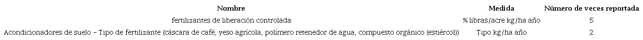 Relacionado con los aditivos químicos utilizados para el mantenimiento e incremento de la productividad, también se tiene en cuenta el uso de fertilizantes para la tierra, materia orgánica del suelo 49) (47) (35; 50, el compost y los abonos verdes (GM) como alternativas para suministrar nutrientes a los cultivos agrícolas con mínimos riesgos ambientales 50. Otro enfoque sugiere agregar fertilizantes orgánicos en cantidades de 10 kg/planta/año, y fertilizantes inorgánicos en forma de Fosfato de Roca 240, Urea 400 y KCl 320 g/planta/año 47, en ambos casos se registra un incremento en la altura de la planta, el diámetro de la copa (CD), el número de ramas plagiotrópicas (tallo que crece de manera horizontal o inclinada) (PBN) y el rendimiento (sacos de 60 kg/ha) 47) (50. Otra clase de fertilizantes naturales fueron los probados en 49 donde se utilizaron cuatro abonos: cáscara de café, yeso agrícola, polímero retenedor de agua y compuesto orgánico y se comparó con suelos sin estos abonos, encontrando que con el uso de Urochloa decumbens + cáscara de café/compuesto orgánico + fertilizantes de liberación controlada se obtiene un mayor crecimiento y rendimiento de las plantas de café.