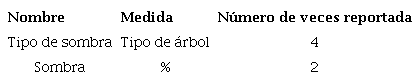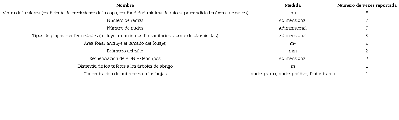 Sombras: en la predicción del rendimiento de los cultivos de café las investigaciones reportan distintas variables, factores o atributos, algunos de estos trabajos tienen como objetivo examinar los efectos que ocasiona la interacción de las sombras de los árboles y la textura del suelo con estados reproductivos en el rendimiento del café 28) (29, la comparación del rendimiento de los cafetales con y sin la presencia de árboles leguminosos 30) y el control y efecto de los factores bióticos y abióticos de distintas plantas que dan sombra 31. La sombra habitualmente se mide en un porcentaje (%) presente sobre las plantas de café, lo que conlleva a una intensificación del tipo de suelo bajo esta (arcilloso, arenoso, limoso), afectando directamente la productividad del café medido en kg/ha, sacos/ha o litros/planta; frecuentemente la unión de estos factores se evalúa o registra en periodos reproductivos jóvenes y estados avanzados de edad, en períodos de cosecha, lo que a su vez permite seleccionar el mejor tipo de genotipo acorde a la condición predominante en el cultivo 32. La Tabla 6 resume las variables encontradas en relación con la sombra en los cultivos de café.