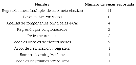 Los modelos/algoritmos/técnicas más usadas para la predicción del rendimiento en los cultivos de café incluyen a la regresión lineal múltiple (lasso o neta elástica), bosques aleatorizados, regresión por conglomerados, redes neuronales, arboles de clasificación y regresión, máquinas de aprendizaje extremo, modelos lineales de efectos mixtos, modelos bayesianos jerárquicos, ANOVA y MANOVA. Adicionalmente, PCA (análisis de componentes principales) fue utilizado en la fase de procesamiento de los datos en algunos de los artículos revisados.