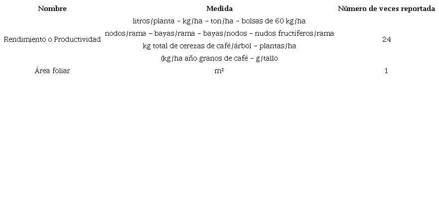La variable objetivo para medir el rendimiento mayormente reportada es aquella que gira en torno al cálculo y/o análisis del rendimiento en los cultivos de café, medida en litros/planta, kg/ha, ton/ha, bolsas de 60 kg/ha, nodos/rama, bayas/rama, bayas/nodos, nudos fructíferos/rama, kg total de cerezas de café/árbol, plantas/ha, kg/ha año granos de café y g/tallo. También con un enfoque satelital se relaciona el incremento del área foliar en m² con el aumento del rendimiento de los cultivos de café.