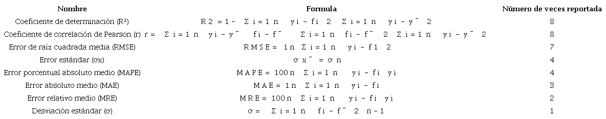 Las métricas más comúnmente usadas para medir la calidad de los modelos de predicción de rendimiento de los cultivos de café, partiendo de que es una tarea de estimar un valor real continuo son R2, RMSE, MAE, Coeficiente de correlación de Pearson, Error estándar, MAPE, MRE y Desviación estándar.
