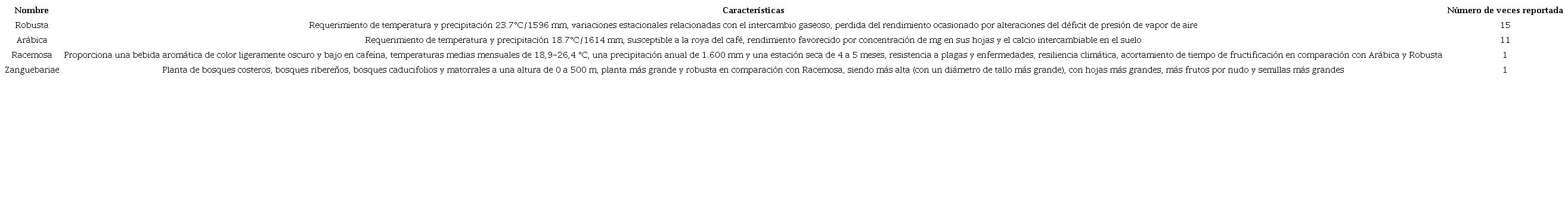 Finalmente, en 53) se observaron otras dos especies de café: racemosa y zanguebariae, los cuales poseen rasgos útiles para el desarrollo de las plantas de cultivo de café, particularmente la tolerancia al calor, el bajo requerimiento de precipitaciones, la tolerancia a la estación seca y el rápido desarrollo de frutos (aproximadamente 4 meses de floración a frutos maduros), además son más resistentes a las plagas y enfermedades particularmente al minador de la hoja del café, en comparación con las especies Arábica y Robusta.