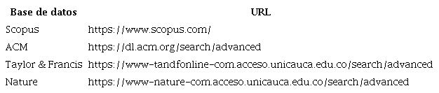 La Tabla 2, muestra las fuentes de los documentos (índices o bases de datos científicas) utilizadas para realizar la búsqueda de los artículos publicados. En cada una de ellas se usó la opción de búsqueda avanzada.