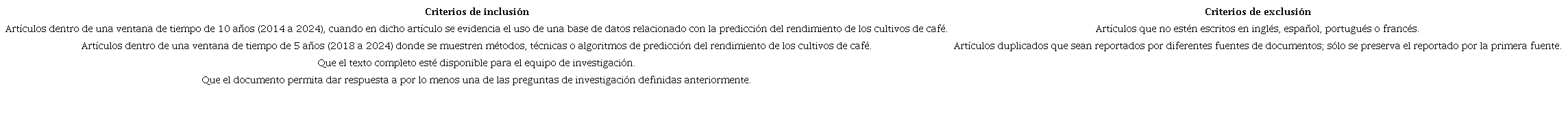 Una vez elaboradas las cadenas de búsqueda e identificadas las fuentes de los documentos, se procedió a establecer los criterios de inclusión y exclusión con la finalidad de seleccionar los artículos afines con los objetivos de investigación. Estos criterios se muestran en la Tabla 3.
