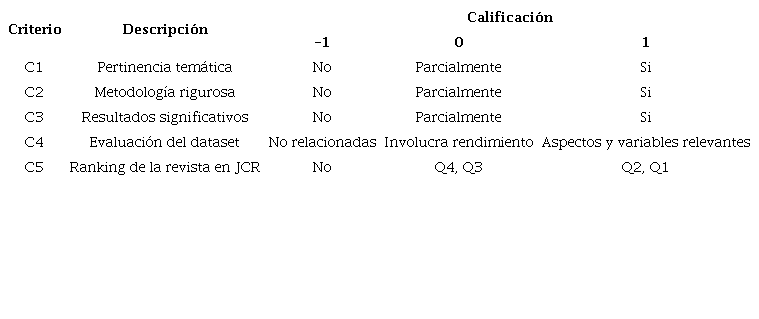 El criterio de calidad 1 (C1) relacionado con la “Pertinencia temática” busca establecer el nivel en el que el artículo aborda aspectos relevantes o proporcionan información valiosa sobre métodos, técnicas, algoritmos, factores o características de los cultivos y datos que influyen en el rendimiento de los cultivos de café. La evaluación de este criterio implica analizar la relación directa de los documentos con los cultivos de café, la exhaustividad y profundidad de los datos presentados, la validez y relevancia de la información proporcionada, la originalidad en términos de avances en el conocimiento y la utilidad práctica de los conceptos expuestos. La integración de estos factores permite establecer el grado de relevancia temática del artículo en el ámbito de la predicción del rendimiento de los cultivos de café. El criterio de calidad 2 (C2) relacionado con “Metodología rigurosa” busca establecer el grado en que el artículo utiliza métodos científicos rigurosos, confiables y repetibles, describiendo claramente el diseño del estudio, la muestra de datos utilizada, las variables medidas y el apropiado análisis y comparación (si aplica) de los resultados obtenidos. El criterio de calidad 3 (C3) relacionado con “Resultados significativos” busca establecer el nivel en que el artículo presenta resultados significativos y relevantes para el objetivo del estudio del mapeo sistemático. El artículo debe proporcionar información útil sobre los efectos de los diferentes factores en la producción de café y ayudar a identificar los elementos principales que afectan la precisión en la predicción de su rendimiento. La cuantificación de este criterio considera la importancia de los resultados en el contexto del estudio, destacando su contribución a la comprensión y mejora de la producción cafetera. El criterio de calidad 4 (C4) relacionado con “Evaluación del dataset” busca determinar la calidad del conjunto de datos usado en el artículo, describiendo sus variables, factores o atributos y la amplitud de estos en relación con el contexto de la aplicación, es decir, que incluya variables relacionadas con la dinámica ambiental, la topográfica y/o las prácticas de cultivo, datos sobre el suelo, entre otros. Un valor de 1 representa datos exhaustivos y altamente relevantes, enriqueciendo la investigación. Un valor de 0 indica datos adecuados, pero con espacio para mejoras en la completitud. Un valor de -1 denota datos insuficientes y poco relevantes para el estudio. Esta escala cuantifica la calidad del conjunto de datos, siendo mayor cuanto más completo y pertinente es para la investigación. El criterio de calidad 5 (C5) relacionado con “Ranking de la revista en JCR” busca evaluar la calidad de la revista donde el artículo fue publicado, en este sentido se presume que entre mejor sea el cuartil reportado en el JCR más exigente ha sido el proceso de revisión previa a su publicación.