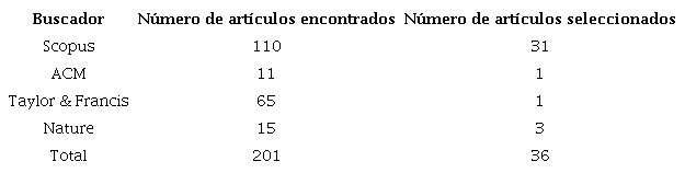 La Tabla 5, muestra los resultados de la búsqueda ejecutada. La búsqueda primero se realizó en Scopus y luego en las otras fuentes en el mismo orden en el que aparecen en la tabla. Para cada uno de los artículos encontrados en cada fuente se leyó su título, resumen y palabras clave; con esta información y la aplicación de los criterios de inclusión y exclusión se seleccionaron los artículos relevantes para el mapeo o se descartaron. En la medida que se revisaban nuevas fuentes también se descartaron los documentos duplicados. Al final se contó con 36 artículos relevantes para el mapeo los cuales pasaron a la fase de evaluación de la calidad. De esos 36 se descartaron 9 por su baja calidad.