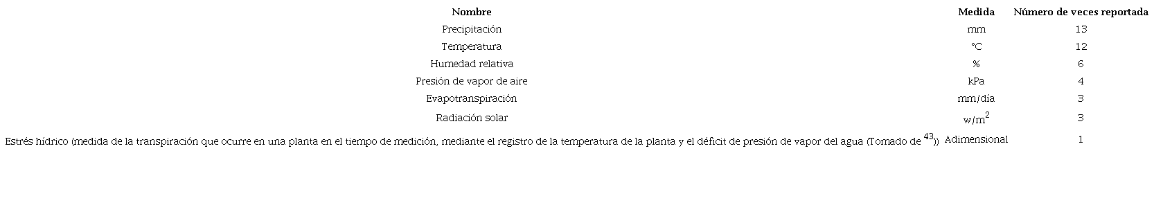 Otras variables climáticas relacionadas con la productividad del café incluyen la humedad relativa (%RH) 36 y la presión de vapor (VPD en KPa) 37) (38) (39; en esta última investigación se logró identificar un umbral de rápida disminución del rendimiento que se presenta cuando esta variable está por encima de 0,82 kPa y a su vez, se definió un intervalo de temperatura de 2°C a 2.9°C sobre el cual si el calentamiento global llega a superar, lo más probable es que los países que representan el 90% del suministro mundial de café perciban una drástica disminución en la producción. De esta forma se introduce la variable trasversal a la mayoría de las investigaciones relacionadas con productividad y clima, por ejemplo, en 37; 40 se percibe la influencia de la temperatura (°C) en el rendimiento del café Robusta, determinando que cada aumento de 1°C en las temperaturas medias, mínimas o máximas por encima de 16,2/24,1 °C corresponde a una disminución del rendimiento de aproximadamente 14% o 350-460 kg/ha. En 33) (40) (35) (38) (39) (36, la temperatura se agrega generalmente como atributo al conjunto de datos de entrenamiento para los diferentes modelos, se mide con temporalidad trimestral y se incluye con valores promedio, mínimo y máximo.