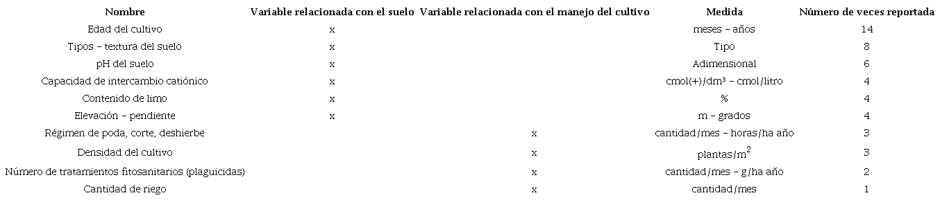 Variables utilizadas para predecir el rendimiento en los cultivos de café