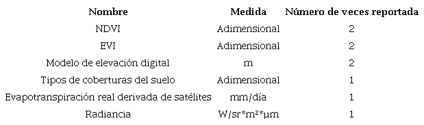 En resumen, los artículos consultados revelan que las variables más utilizadas para determinar el rendimiento de la productividad en los cultivos de café incluyen aspectos como: el porcentaje de cobertura y los tipos de sombras sobre los cafetales, producidos por: solo árboles de leguminosas, árboles de leguminosas y plantas de banano, y otras plantas, o solo árboles frutales o forestales; de igual forma los índices de vegetación (NDVI, EVI) obtenidos de imágenes satelitales que se correlacionan con la productividad de los cultivos de café. Otro aspecto para tener en cuenta son los atributos relacionados con el clima o la atmosfera, dentro de las que cabe resaltar variables como temperatura (°C), precipitación (mm), humedad relativa (%RH), estrés hídrico (litros requeridos por litros renovables), presión de vapor (kPa) y déficit de agua mensuales (mm/mes).