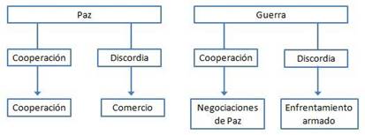 Esta visión permite establecer un puente entre las contradicciones fundamentales señaladas por la teoría realista de las relaciones internacionales (paz/ guerra) por una parte, y la identificada por la interdependencia (cooperación/discordia) por la otra. Esta lógica se expresaría de la siguiente manera: