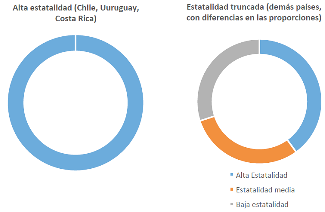 La distinción entre Chile, Uruguay y Costa Rica y los demás países de América Latina respecto a los niveles de estatalidad y la presencia de estas fallas y de zonas de precariedad puede ilustrarse en la siguiente comparación. Las zonas azules indican penetración estatal homogénea, territorial y funcionalmente, alta estatalidad; zonas verdes, estatalidad parcial, y zonas marrones, baja estatalidad.