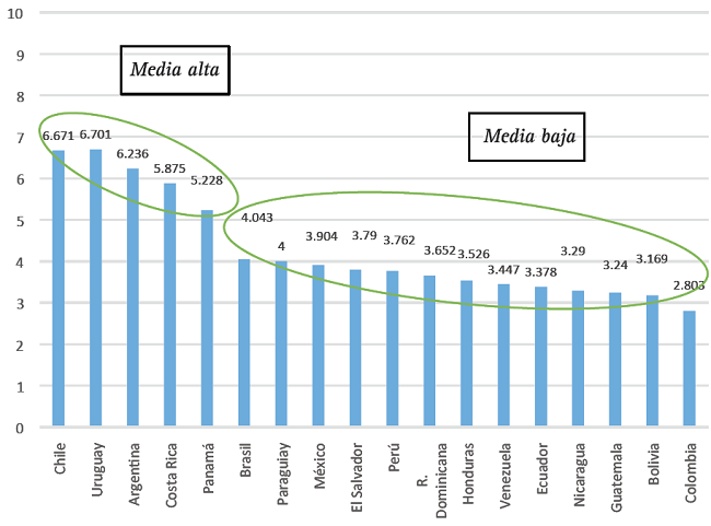 Se ha procedido a reordenar las categorías y a ponderar los puntajes propuestos y se ha pasado de una escala de 120 puntos a una que va de cero a 10, diferenciando cuatro categorías de estatalidad: alta (más de 7500), media alta (entre 5000 y 7500), media baja (entre 2500 y 4999) y baja (menos de 2500).9 Se calcularon los promedios para cada país para el período (véase gráfica 2): cinco países presentan un nivel medio-alto de estatalidad (Uruguay, Chile, Argentina, Costa Rica y Panamá) y los demás tienen un bajo nivel de estatalidad. Ningún país puede ubicarse con un nivel de alta estatalidad, como ocurre con todos los países de Europa occidental y los países nórdicos.10 Dentro del grupo de estatalidad medio-alta se incluyen los tres países que O’Donnell siempre diferenció de los demás países del subcontinente (Chile, Uruguay y Costa Rica), pero también clasifican Argentina y Panamá, aunque presentan más oscilaciones entre uno y otro año y son menos homogéneos.