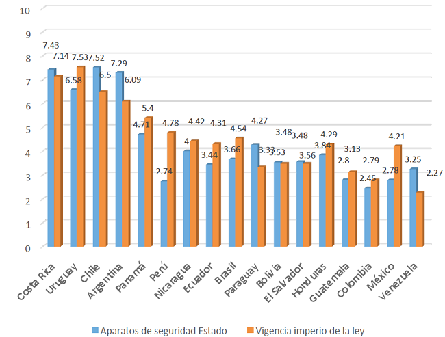 Dentro de este índice son especialmente relevantes para la medición de la penetración territorial del Estado los indicadores Imperio de la ley y Efectividad de los aparatos de seguridad y convivencia. Con ellos cuales se considera el grado de cobertura de las instituciones estatales con las que concreta su dimensión coercitiva. Como se observa en el gráfico 3, la medición de Found of Peace para el período analizado indica que los tres países que se diferencian del resto del subcontinente en sus niveles de estatalidad (Uruguay, Chile y Costa Rica) presentan los valores más altos. Por su parte, los aparatos de seguridad garantizan la coerción centralizada e impiden que otros actores armados le disputen al Estado territorios, esferas del poder, zonas intraurbanas, regiones o sectores de la economía.