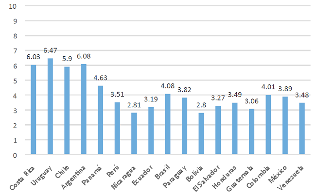 De nuevo, cuando O’Donnell aludía a la ciudadanía de baja intensidad también consideraba que una porción significativa de la población no podía obtener los servicios de los organismos estatales a los que tienen derecho como ciudadanos y que son responsabilidad del Estado. El indicador de The Fund for Peace incluye la provisión de los servicios de salud, educación, agua y saneamiento, infraestructura de transporte, electricidad y energía, e internet y conectividad. A diferencia de las dos dimensiones que incluye las acciones coercitivas centralizadas y la vigencia del imperio de la ley en los que se mantiene la diferencia de los tres países destacados sobre los demás (Chile, Costa Rica y Uruguay), en esta dimensión los déficits son generalizados, aunque son menores en estos países, de igual forma que en Argentina (véase gráfico 4).