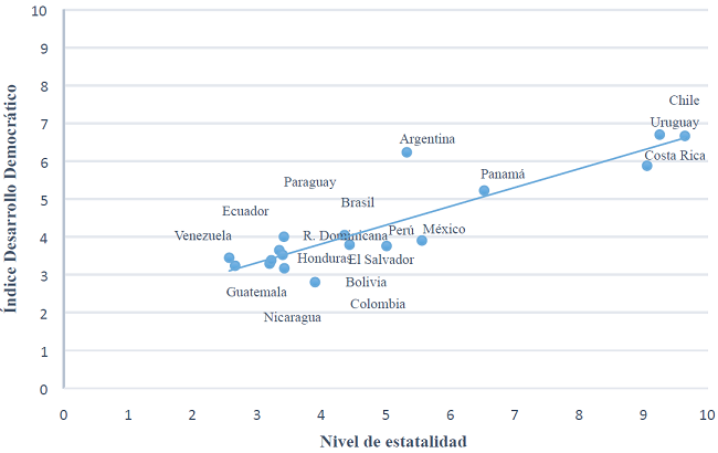 La otra parte del argumento de O’Donnell se refiere a la relación entre los niveles de estatalidad y el desarrollo de la democracia. Aunque existen varias alternativas de medición de la democracia, en este análisis se optó por el Índice de Desarrollo Democrático (IDD) de la Corporación Polilat por tres razones: cubre un periodo que permite ver la evolución de los indicadores y ponderar al menos una década; brinda información de todos los países de América Latina, lo cual permite un análisis de conjunto; e incluye variables e indicadores que miden la democracia política, pero también social y de gestión de los gobiernos respectivos. El IDD mide la democracia política (sufragio y participación política), los derechos políticos y las libertades civiles; la calidad institucional y la eficiencia política; y el ejercicio del poder efectivo para gobernar. Se mide entre 0-10 agregando los diversos indicadores de las cuatro dimensiones.