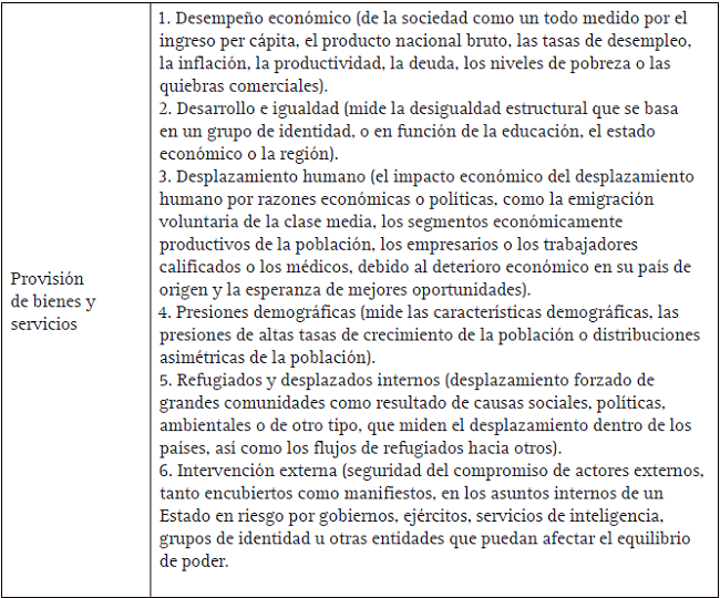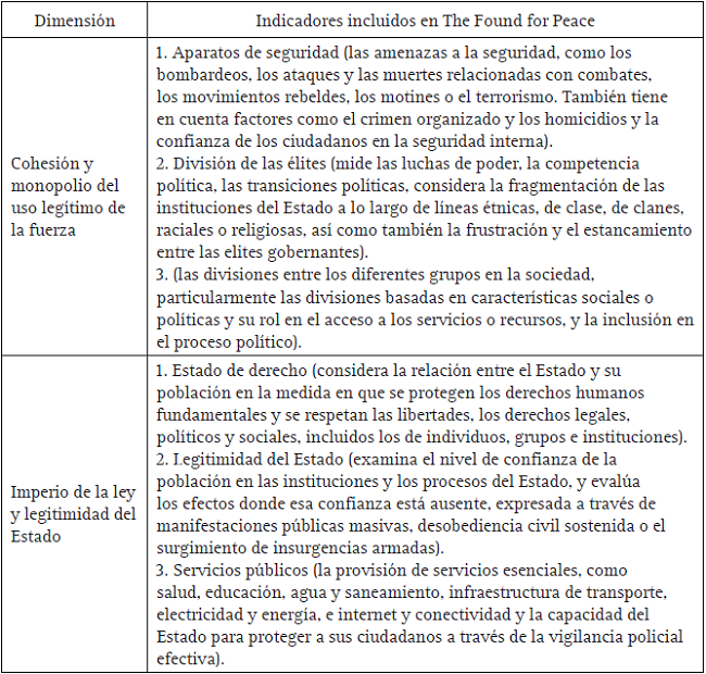 Con base en las dimensiones, los Estados más frágiles presentan pérdida del control físico del territorio o del monopolio del uso de la fuerza; erosión de legitimidad de la autoridad de turno para llevar a cabo decisiones colectivas; incapacidad de proporcionar acceso a servicios públicos básicos a sus ciudadanos; incapacidad de interactuar con otros Estados como miembro propio de la comunidad internacional.11 Por oposición, un Estado fuerte es aquel que provee un entorno propicio para un crecimiento económico sostenible y equitativo; cuyas instituciones son manejadas con transparencia y responsabilidad, y cuentan con alta legitimidad social; preservan la integridad de su población frente a posibles eventos o conflictos violentos (para ello, controlan su territorio y ejercen el monopolio del uso legítimo de la fuerza); además, garantiza el acceso de bienes y servicios a su población, lo cual permite altos grados de bienestar social. En el intermedio entre los extremos se ubican Estados con niveles diferenciados de estatalidad.