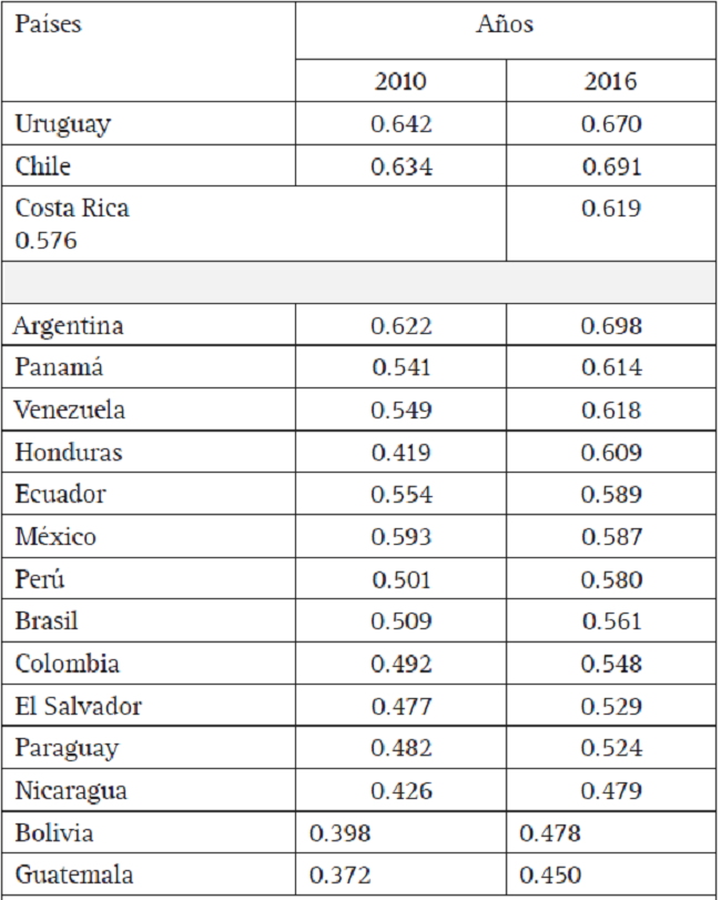 En el año 2010 el respectivo informe señalaba “América Latina y el Caribe es la región más desigual del mundo. La desigualdad no sólo es alta, sino también muy persistente”;20 el más reciente de informe de 2016 reitera esta situación. Como se observa en la tabla 2, aun los países con mejores indicadores presentan severas limitaciones en el desarrollo humano y grandes brechas en la distribución de la riqueza. Los datos muestran que la acción estatal y las políticas públicas no propician un acceso general a bienes y servicios ni condiciones propicias para un mejoramiento en las condiciones de vida de la gente. Se reiteran las diferencias entre los tres países de mayor estatalidad del resto de naciones (con los casos intermedios ya señalados de Argentina y Panamá) y, con valores muy inferiores para la región andina y Centro América.