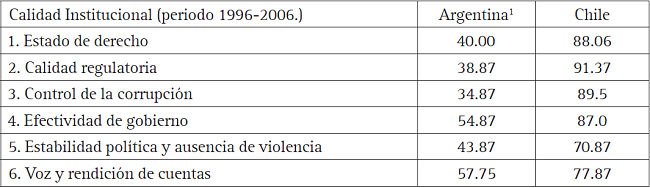 En el contexto transicional, estos países muestran avances democráticos desemejantes que se reflejan en la calidad de sus instituciones de acuerdo con la evaluación de los valores democráticos. Uno de estos valores es la transparencia y la rendición de cuentas. El indicador promedio de voz y rendición de cuentas para Argentina en el periodo 1996-2010 es de 58.83, mientras que el de Chile es de 79.98 percentiles. Corresponde observar que el ranking de Argentina en 1998 es de 57.46, inicio del periodo de crisis económica y financiera; en 2010, ocupa la posición 59.71; Chile incrementa su posición de 65.67 en 1998 a 82.70 percentiles en 2010.