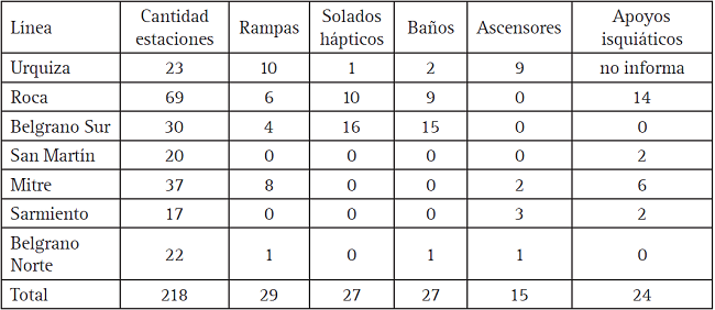 El expediente 110509/2013 de la Comisión Nacional de Regulación del Transporte detalla el resultado de un relevamiento técnico realizado en las siete líneas ferroviarias del Área Metropolitana de Buenos Aires. Debido a la variedad y complejidad de los datos, hemos decidido sistematizarlos y elaborar el cuadro 1. En éste, exponemos la cantidad total de estaciones de cada línea ferroviaria, así como información sobre cuántas de ellas cumplen con los requisitos de accesibilidad dispuestos en la normativa (rampas, baños accesibles, solados hápticos, ascensores y apoyos isquiáticos).