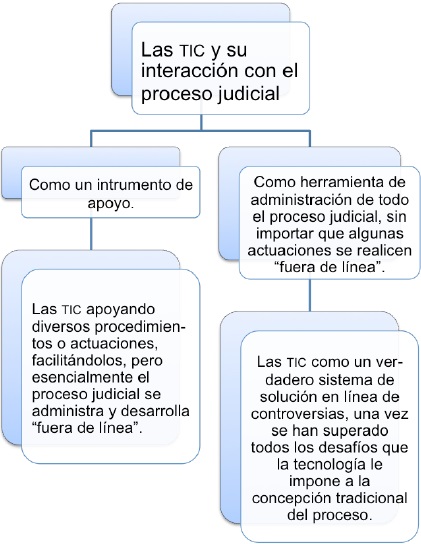 Como se observa en el esquema, las TIC en la justica tiene dos vertientes. La primera es sólo como instrumento de apoyo, ya que el sistema de impartición de justicia se administra sin ellas. La segunda es aquella donde la administración de dicha justicia se realiza en ellas, como verdadera justicia sin papel.