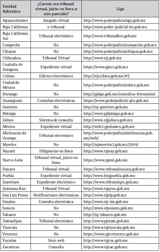 Lo anterior se evidencia después de una revisión en cada portal web de los poderes judiciales de las 32 entidades federativas de la república mexicana, en el recuadro siguiente:40