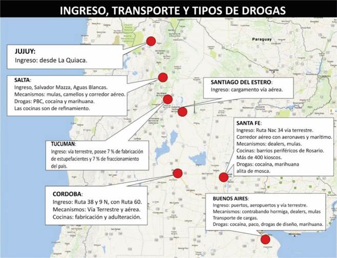 Es posible afirmar que el problema del narcotráfico en Argentina ha transitado en la última década una serie de transformaciones que se produjeron en dos etapas diferenciadas [… ] En una primera etapa, al tradicional circuito de tránsito de clorhidrato de cocaína andina cuyo destino final es el mercado europeo, se agregó una nueva dinámica asociada al crecimiento de los mercados locales de consumo particularmente en los grandes centros urbanos del país. Una segunda etapa en la evolución del problema del narcotráfico aparece entonces una vez que se verifican las transformaciones descriptas en la primera etapa. El crecimiento del circuito de tránsito, así como del orientado al abastecimiento de los mercados locales, incorpora una mayor complejidad en la operatoria de las organizaciones criminales dedicadas a la comercialización ilícita de drogas. En el caso del macro-tráfico, aparece una más delicada división del trabajo con la formación de redes de colaboración segmentada, mayor capacidad de control del circuito de comercialización, de innovación y de cooptación de colaboradores locales. En el caso del micro-tráfico, la aparición de organizaciones locales más complejas, con dominio territorial y mayores índices de violencia asociados a su accionar.12