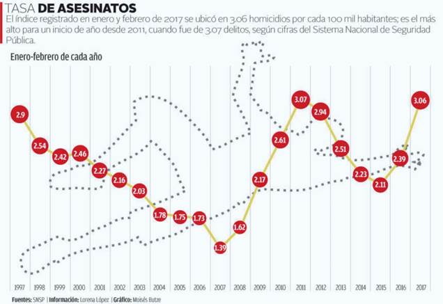 López, Lorena, “Homicidios: en 2017, el peor bimestre desde 2011”, Grupo Milenio, 22 de marzo, 2017. [Consulta: 28 de mayo, 2017 ]. Disponible en: Disponible en: http://www.milenio.com/policia/homicidios-2017-peor_primer_bimestre-2011-asesinatos-snsp-crimen_organizado-milenio_0_924507557.html