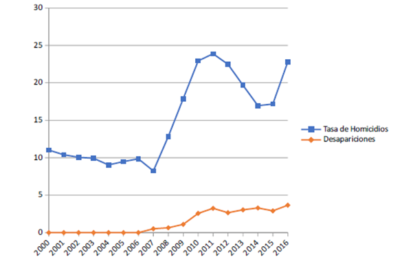 Ahora bien, ¿por qué se observa una disminución de la tasa de homicidios entre 2012 y 2014? Una posible explicación es que los homicidios se esconden en las estadísticas de la cantidad de desaparecidos. Esto supondría que el accionar del Estado ha profundizado su accionar ilegal, lo cual se refleja en parte en las ejecuciones, pero, sobre todo, en las desapariciones.