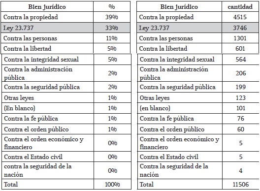 Mientras en el año 2002 78.3% de los detenidos no tenía condena, en el 2012, ese valor era de 56.1%. A nivel federal y en el total país esas cifras se mantienen en torno a 55%, en promedio. En cuanto al tipo de delito, 53.4% estaba detenido por robo, 19.4% por homicidio y 10.1% por delitos contra la Ley 23.737 de drogas. Sin embargo, de ese total, 41.3% estaba privado de libertad por venta y 46.2% por transporte. Asimismo, 78% de los detenidos por delitos contra la ley de drogas fueron apresados en flagrancia.