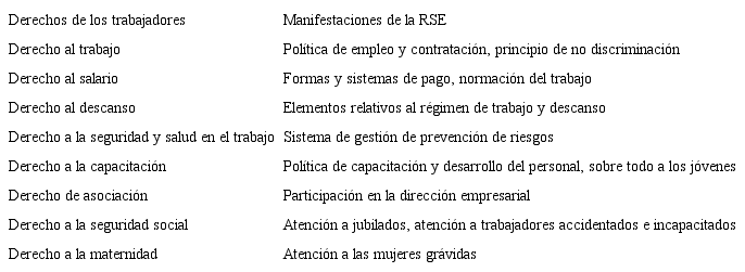 En esencia, en Cuba, la existencia un marco regulatorio que explicita las obligaciones y prerrogativas empresariales en el ámbito laboral en su dimensión interna, con base en los propios valores de la economía socialista, particulariza los elementos de la RSE. Así, contempla entre las obligaciones legales lo que en otros países pueden ser considerados estándares medios de RSE. En ese sentido, la empresa estatal cubana articula la RSE en el ejercicio de los derechos de los trabajadores, tal y como queda esbozado en la siguiente tabla.
