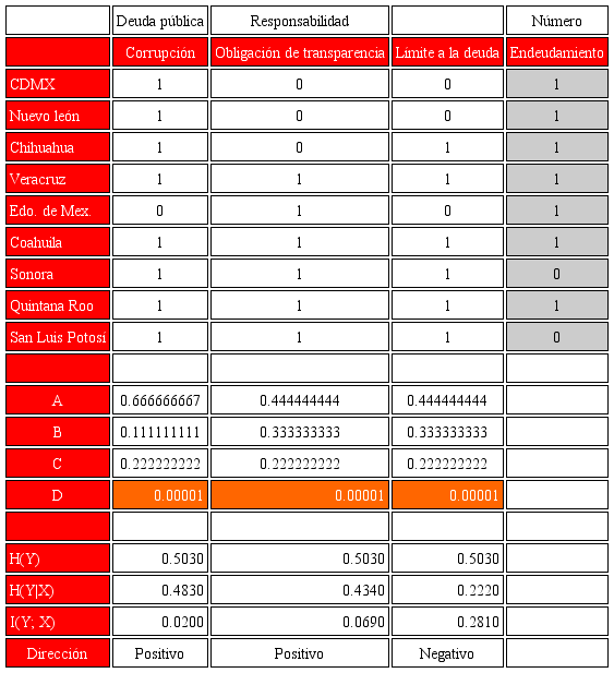 Para sustentar lo anterior se acudió a la aplicación del sistema estadístico utilizado por Drozova y Gaubatz, “Cuantificando lo cualitativo: teoría de la información para el análisis de casos comparables”.34 De acuerdo con este sistema, la teoría de la información nos proporciona una vía universal de cuantificar el contenido de la información y de la incertidumbre que en ella existe.