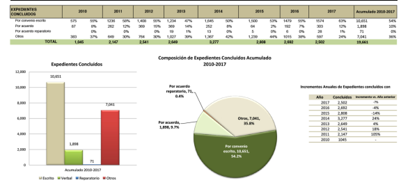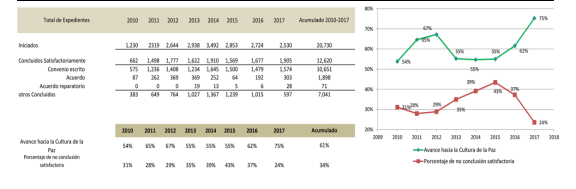 Como se puede observar, en las gráficas anteriores se aprecia el grado de confianza ciudadana; los asuntos resueltos no por acuerdos reparatorios, sino por otros medios, así como el hecho de que los asuntos judicializados han disminuido en algunos años. Ello significa que aunque el delito no disminuyó, en buena medida, los asuntos ya no se judicializaron. Esto se puede deber a diversos motivos, como la solución del conflicto en la fiscalía o no haber realizado la investigación adecuada.