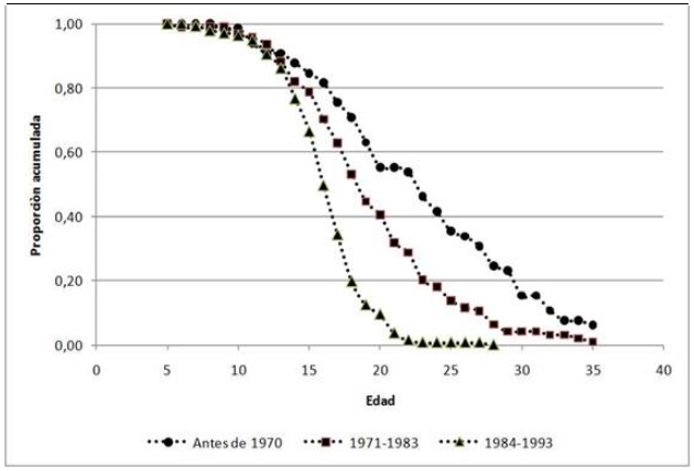 El gráfico I indica la velocidad con la que el grupo de encuestadas experimentó su primera relación con otra mujer; la generación nacida antes de 1970 presenta un alto índice de postergación del evento; es una cohorte en la que, a los 24 años de edad, el 58,5% había tenido su primera experiencia homosexual. Sin embargo, se puede apreciar un cambio generacional debido al aceleramiento del evento en las mujeres nacidas en décadas posteriores, en tanto alcanzaron este mismo porcentaje entre los 16 y 19 años de edad; incluso a la edad de 24 años, las más jóvenes ya habían tenido su primera experiencia en un 99% .