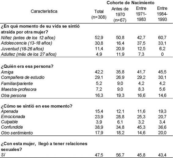 Resultados: . El 83,7% de las mujeres manifestó sentir atracción por otra mujer antes de los 18 años; un 67.5% había tenido en su curso biográfico relaciones sexuales con hombres y con mujeres. Las mujeres mayores de 40 años tardaron más tiempo en reconocer su atracción homoerótica y presentan altos porcentajes de iniciación heterosexual (79,6%), previa a la homosexual.