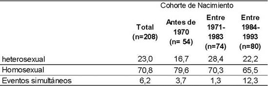 Del total de encuestadas, el 67,5% había tenido, en su curso biográfico, relaciones sexuales con hombres y con mujeres, existiendo diferencias por cohorte; en el caso de las mujeres adultas, se presentan altos porcentajes de iniciación heterosexual (79,6%), que tiende a disminuir 14 puntos porcentuales entre las más jóvenes. También se presenta una tendencia a la simultaneidad del evento entre las más jóvenes (Ver cuadro II).