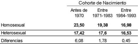 Por otra parte, la edad mediana de la primera experiencia homoerótica presenta un descenso considerable, entre la generación adulta (23,5 años) y la más joven (17 años). Esta disminución se comprende a partir de la postergación de las prácticas homosexuales en las mujeres nacidas antes de 1970, las cuales estaban inmersas en relaciones heterosexuales antes de iniciar su vida erótica con otra mujer, y tuvieron su debut sexual heterosexual a una edad mediana más temprana (17,4 años), y en el rango de edad descrito para las mujeres de su generación en Colombia, es decir, entre los 15-19 años. Entre las mujeres jóvenes existe una cercanía etaria entre ambos eventos.
