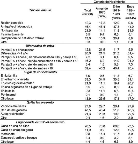 La vía de conocimiento de la pareja de la primera experiencia sexual, generalmente, se da a través de las redes interpersonales y familiares; dos de tres mujeres conocieron a su pareja por medio de la familia, en el barrio o en la escuela. En las generaciones más jóvenes, también aparece Internet como medio para el conocimiento de las parejas sexuales. De igual manera, es importante considerar que, para las mujeres más adultas, las organizaciones o lugares de trabajo constituían contextos para el conocimiento de sus parejas, situación que ha perdido peso relativo entre las más jóvenes, ya que ellas permanecen por más tiempo en el sistema escolar, lo que genera que entren al mundo del trabajo a edades más tardías. Esta situación se evidencia por el mayor peso relativo que el contexto educativo tiene entre las más jóvenes, para conocer la pareja de los primeros acercamientos sexuales. Otra diferencia significativa entre las cohortes de mujeres es la disminución de la categoría "otro lugar", lo que permite percibir que sus relaciones se están integrando cada vez más a los lugares comunes de socialización homosexual.