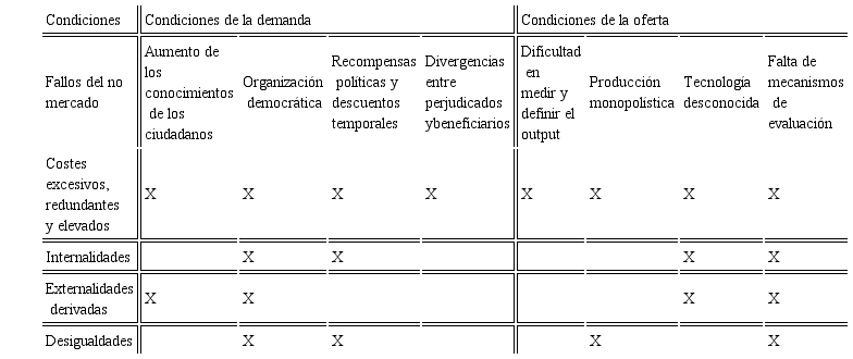 Las circunstancias por las que se demandan intervenciones públicas son muy diversas. En principio, son los ciudadanos, individualmente como votantes, u organi- zados colectivamente en grupos de presión, quienes solicitan políticas a los burócra- tas, a los partidos en la oposición y a los políticos del gobierno, que serían sus oferentes (Dunleavy, 1991). Se distinguen tres causas por las que dichas peticiones tienden a ser excesivas y distorsionadas, generando los “fallos del no mercado” (Wolf, 1995: 46-51).